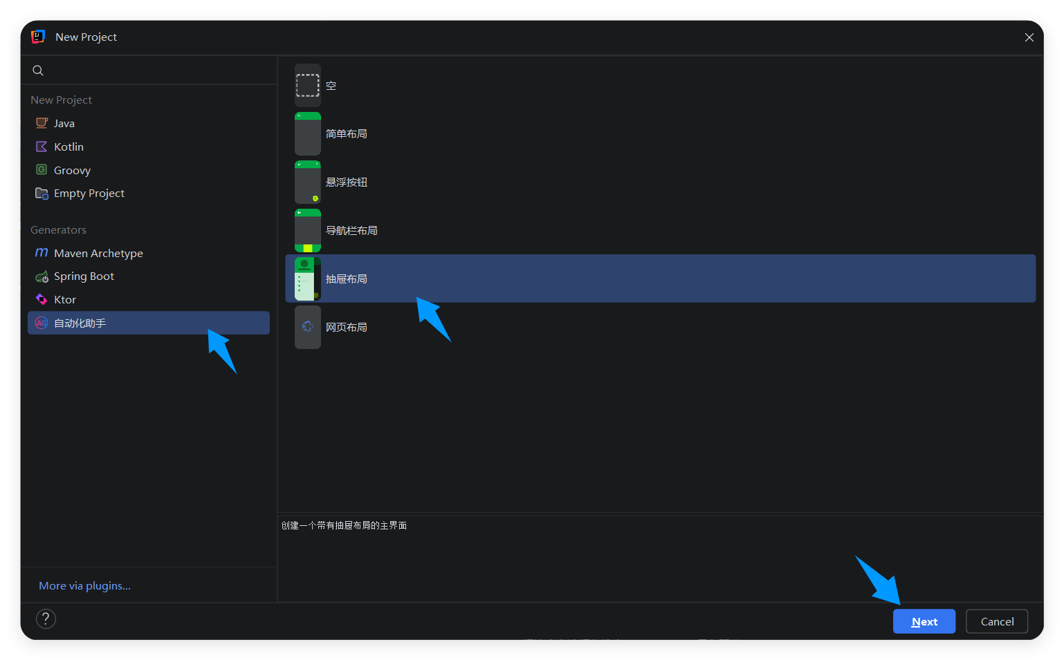 找到自动化助手项目组,选择需要创建的项目模板,我这里选择抽屉布局,因为最常用,之后点击Next。