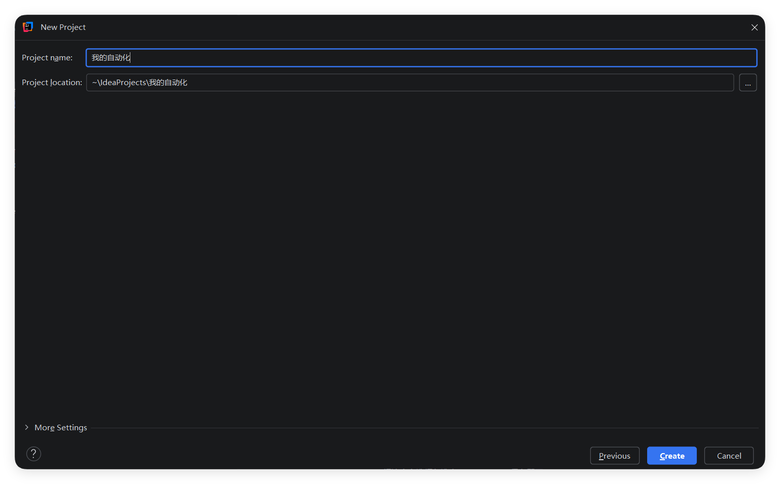 输入项目名称,我这里输入我的自动化,之后点击Create或者回车即可完成项目创建。